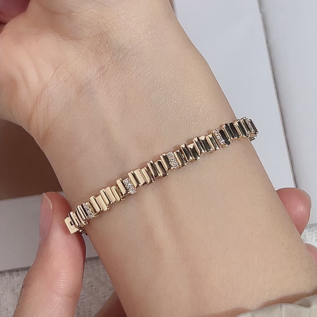 The Ecob-596 Lumière Lineage Bracelet is a modern heirloom forged from light and legacy. Each rectangular link is sculpted from 18K gold, alternating between polished metal and gemstone brilliance—an elegant rhythm of shadow and sparkle.