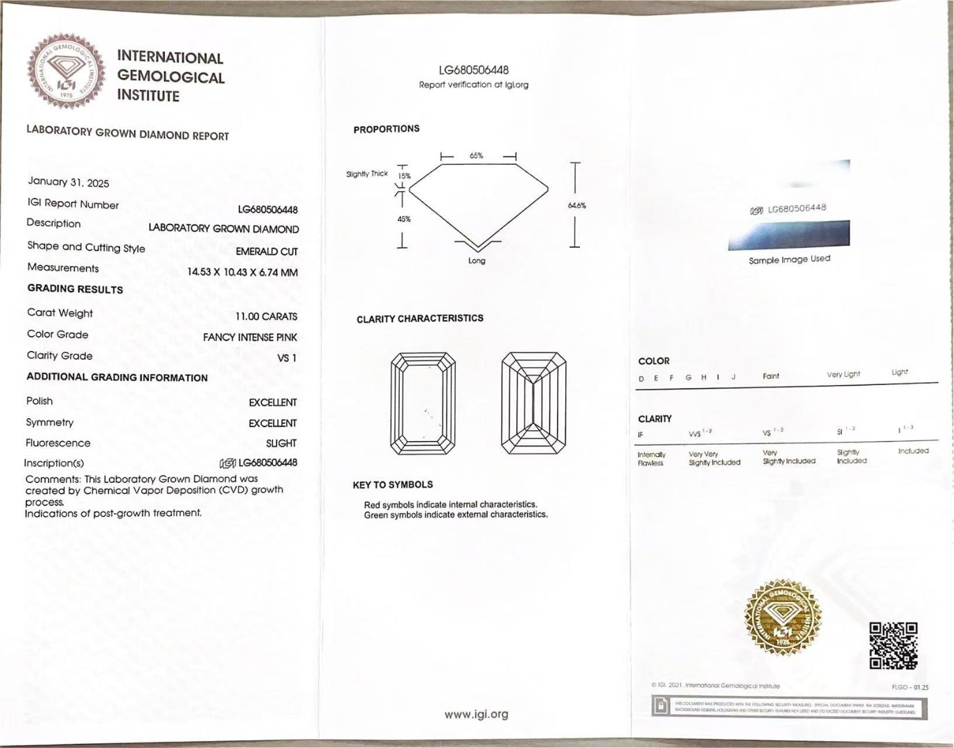 Emerald Cut 11ct Fancy Intense Pink VS1 CVD Lab Grown Diamond IGI Certificate LG 680506448