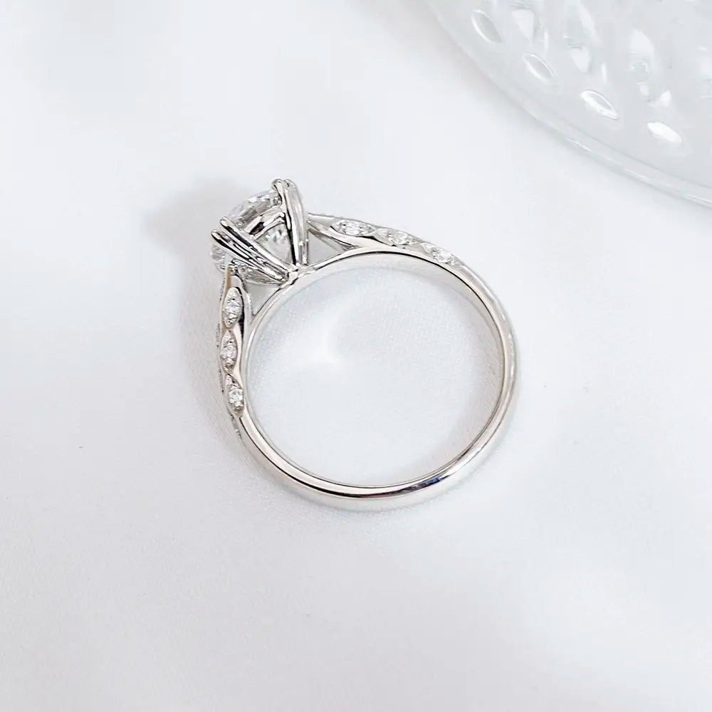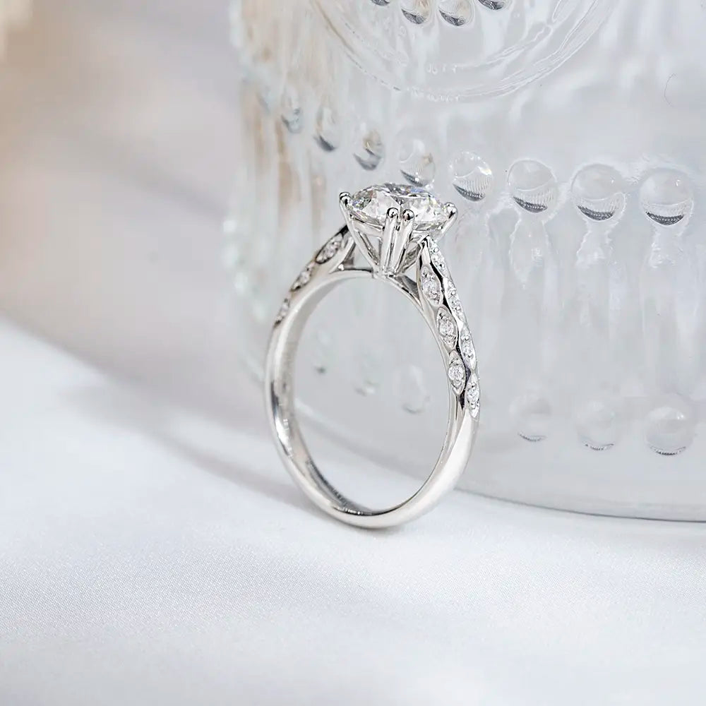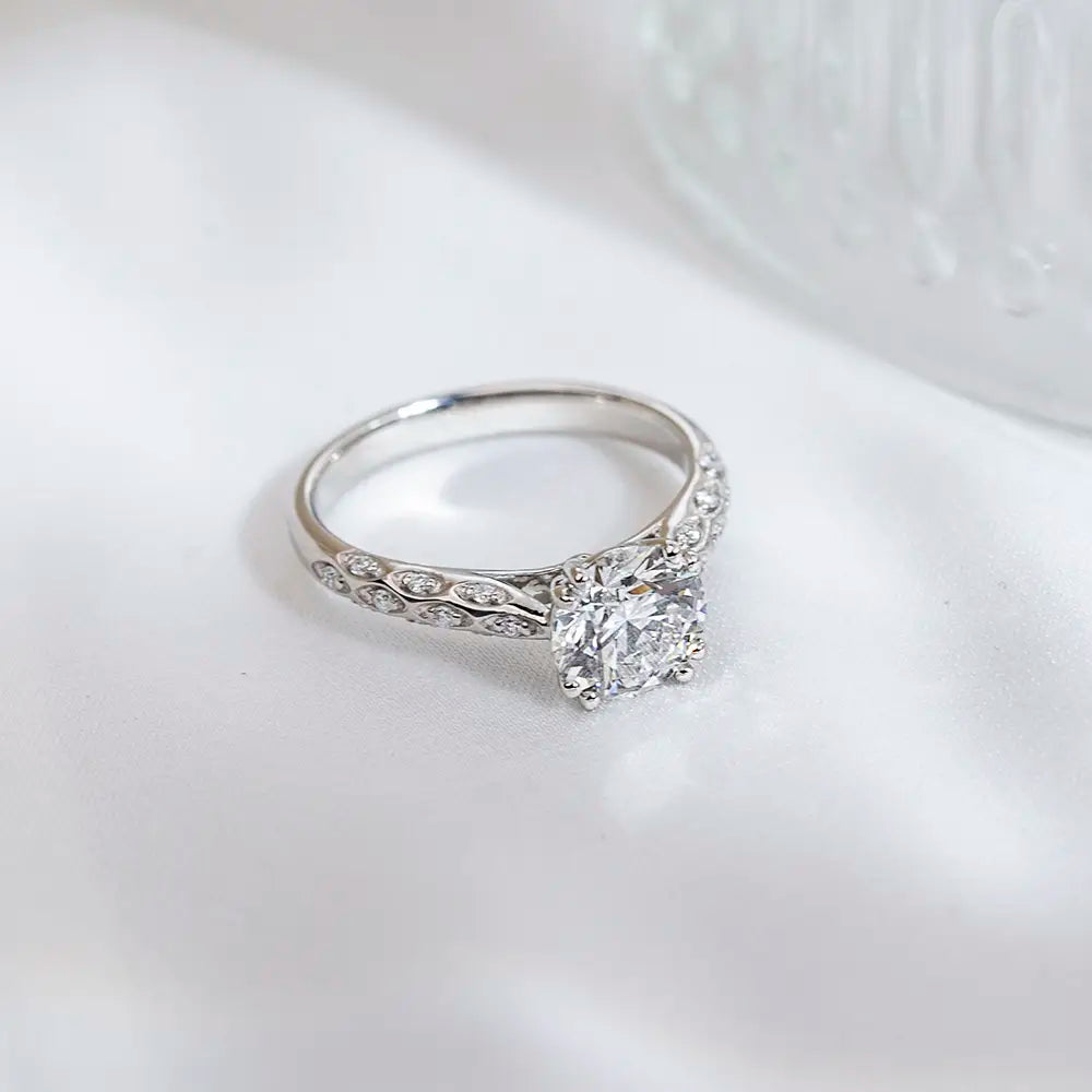 Set in a secure four-prong mount, the solitaire rises above a mirror-polished PT950 platinum band, renowned for its purity and strength. Along the band, a delicate row of pavé-set round lab diamonds adds a soft shimmer, echoing the sparkle of shared laughter and whispered vows.