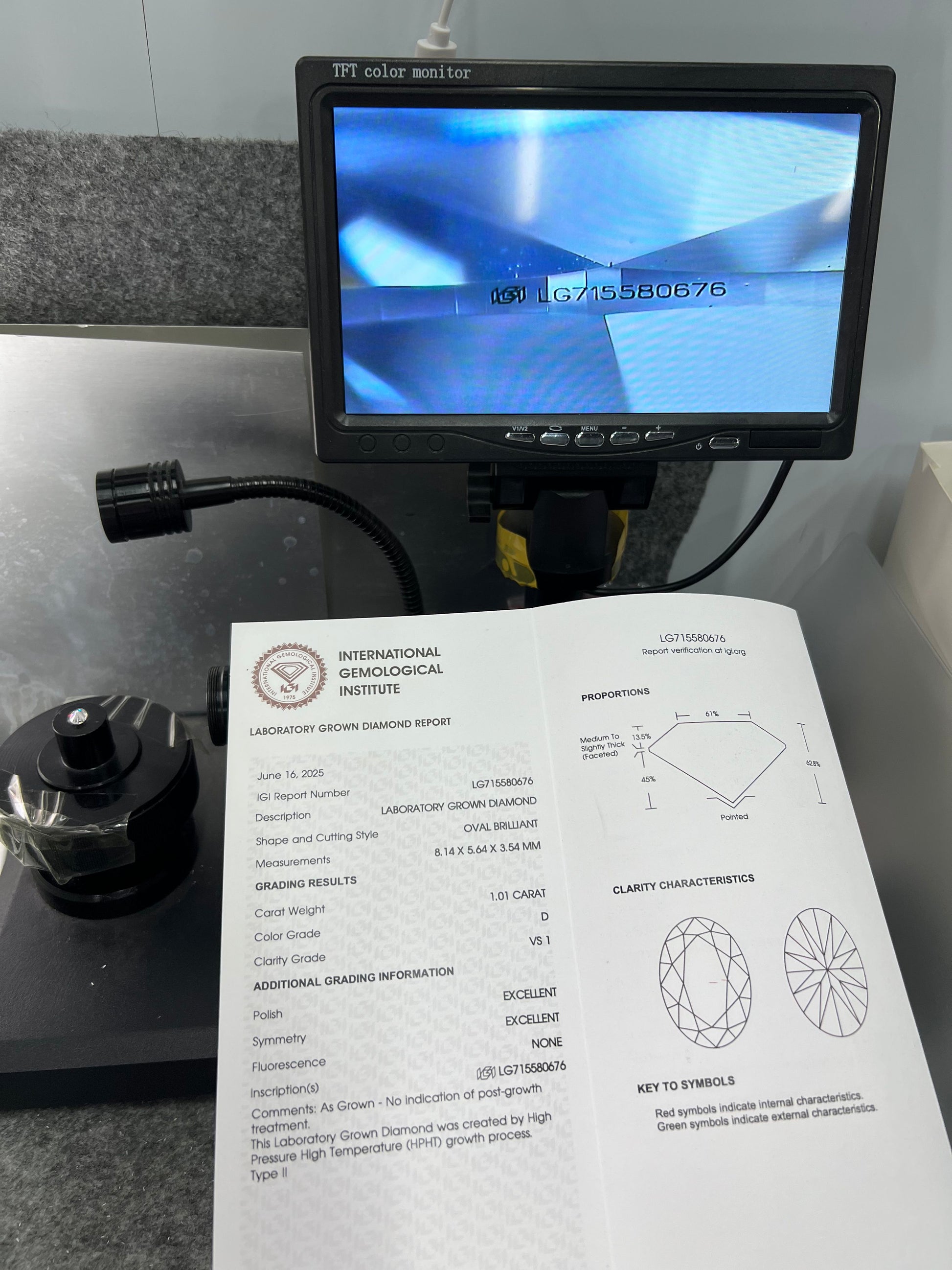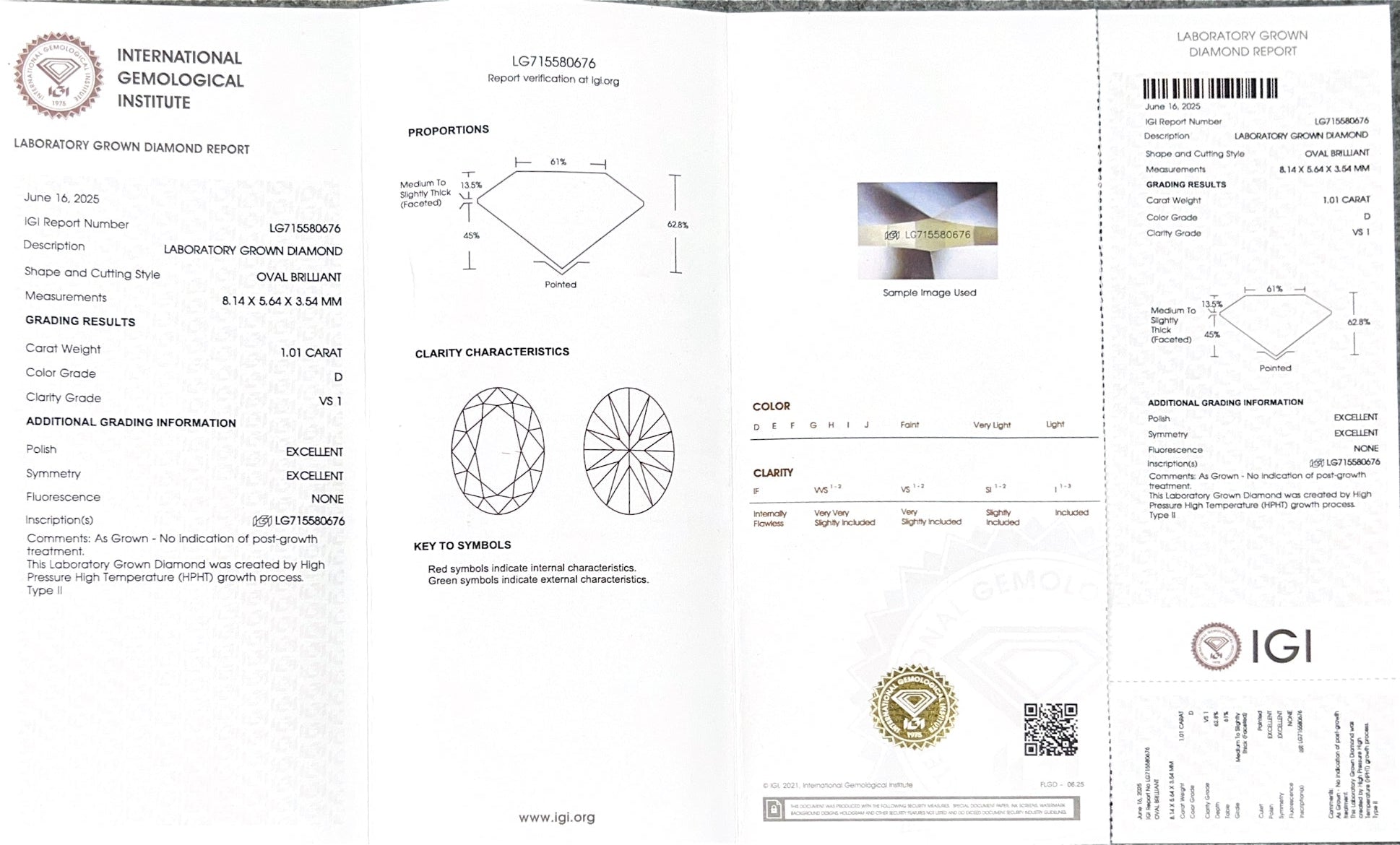 Oval Brilliant D VS1 EX 1.01ct HPHT Lab Grown Diamond with IGI Certificate LG715580676
