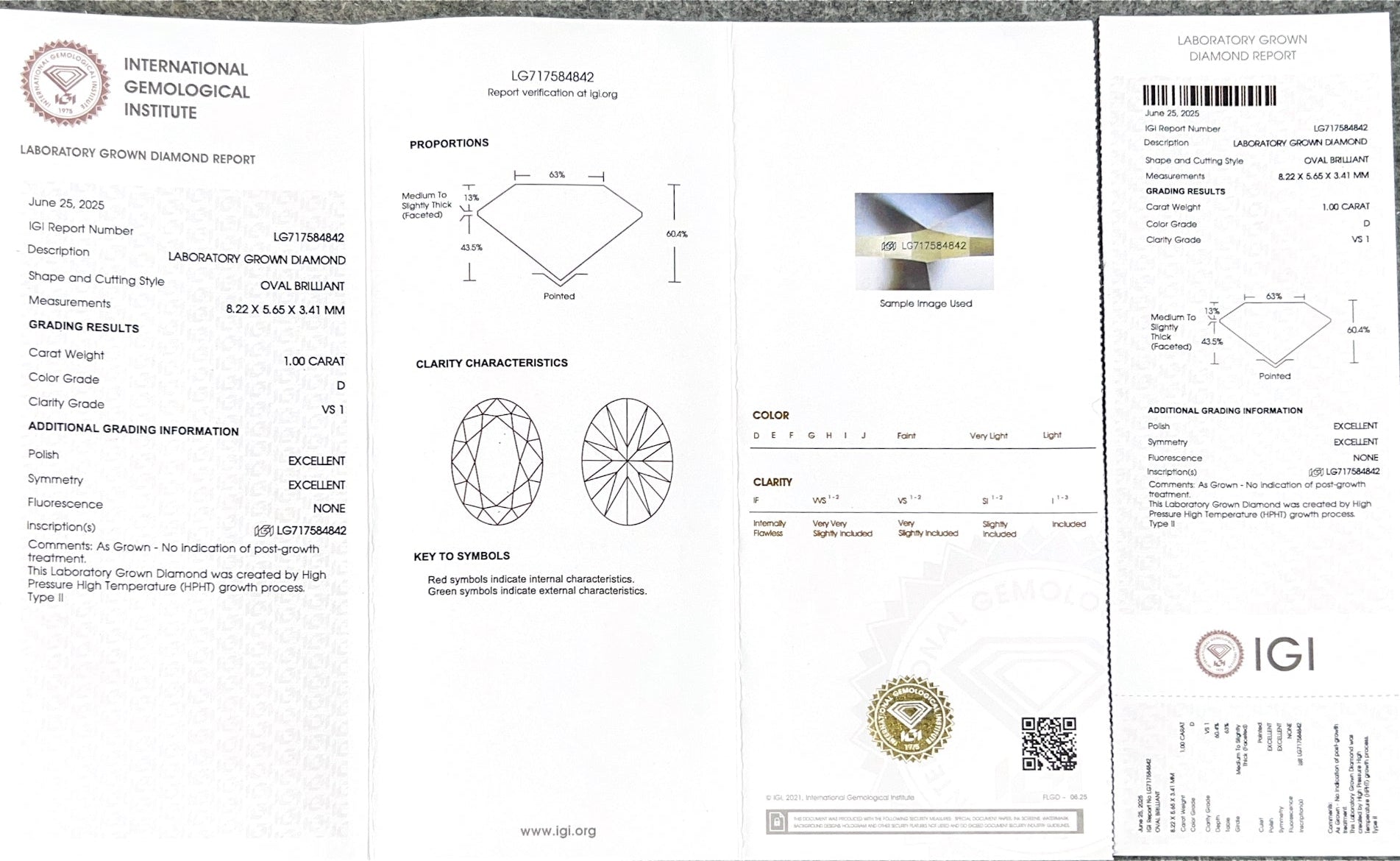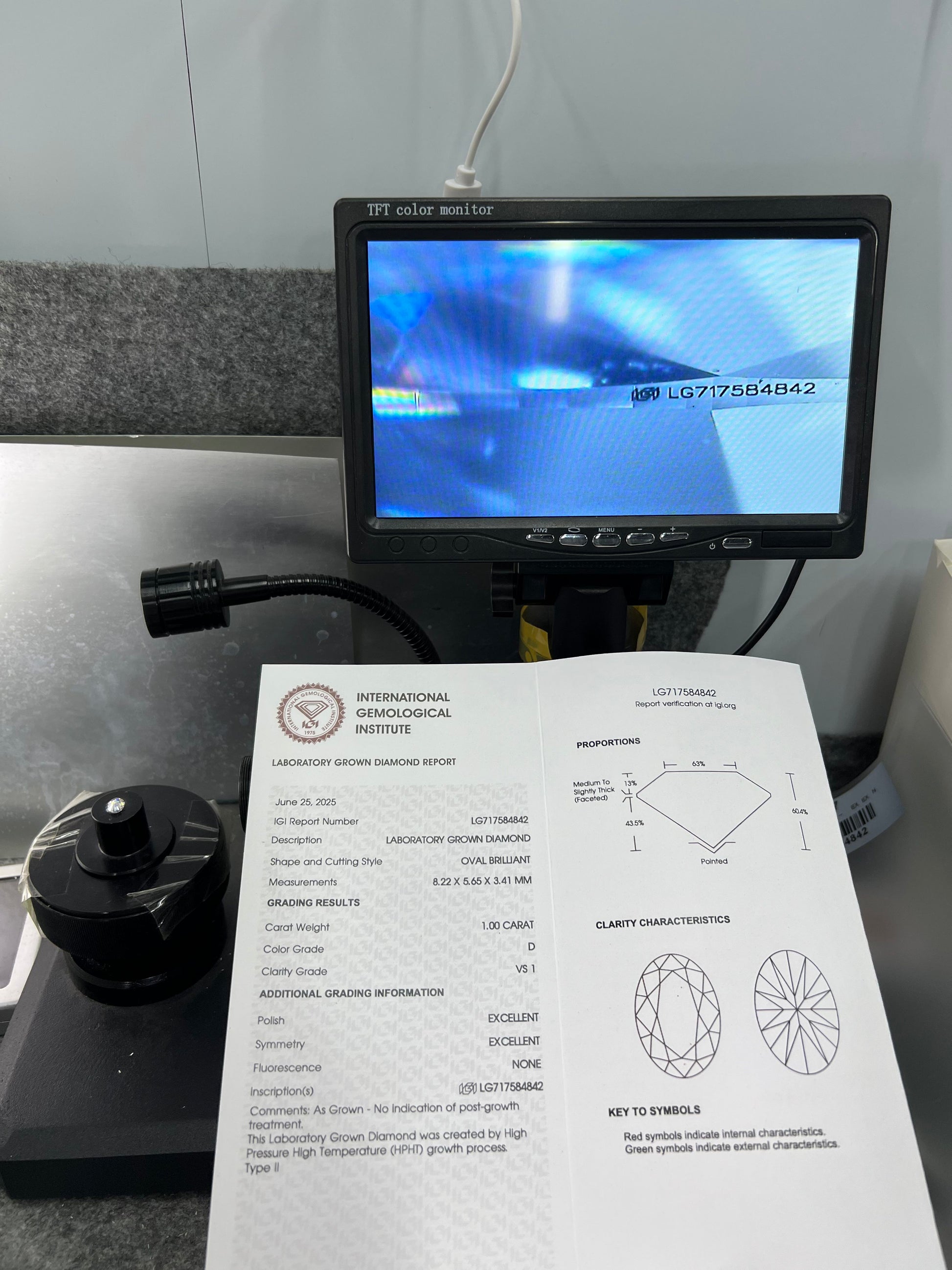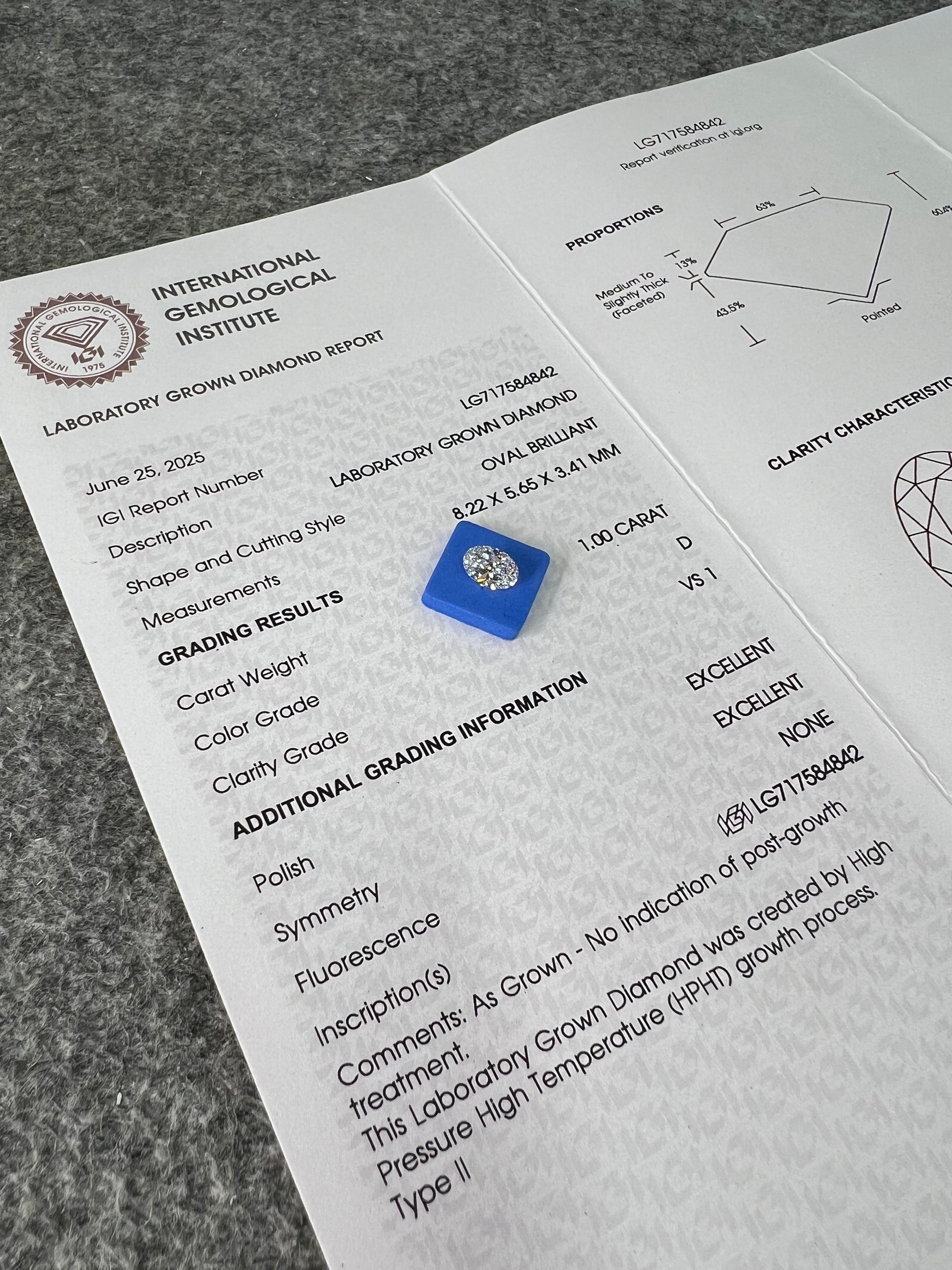Oval Brilliant D VS1 EX 1.0ct HPHT Lab Grown Diamond with IGI Certificate LG717584842