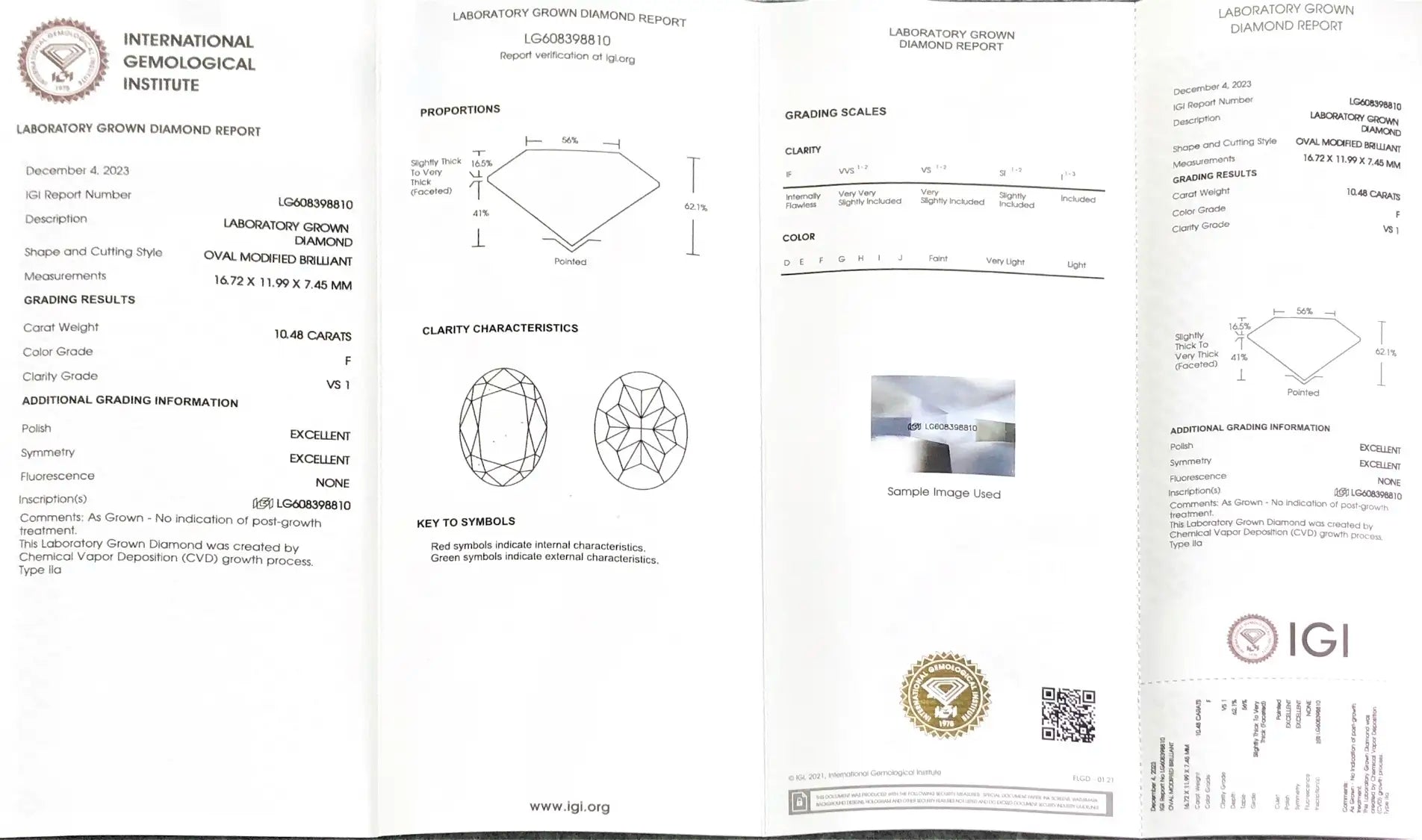 Oval-Cut F VS1 EX 10.48ct CVD Lab Grown Diamond with IGI Certificate LG608398810