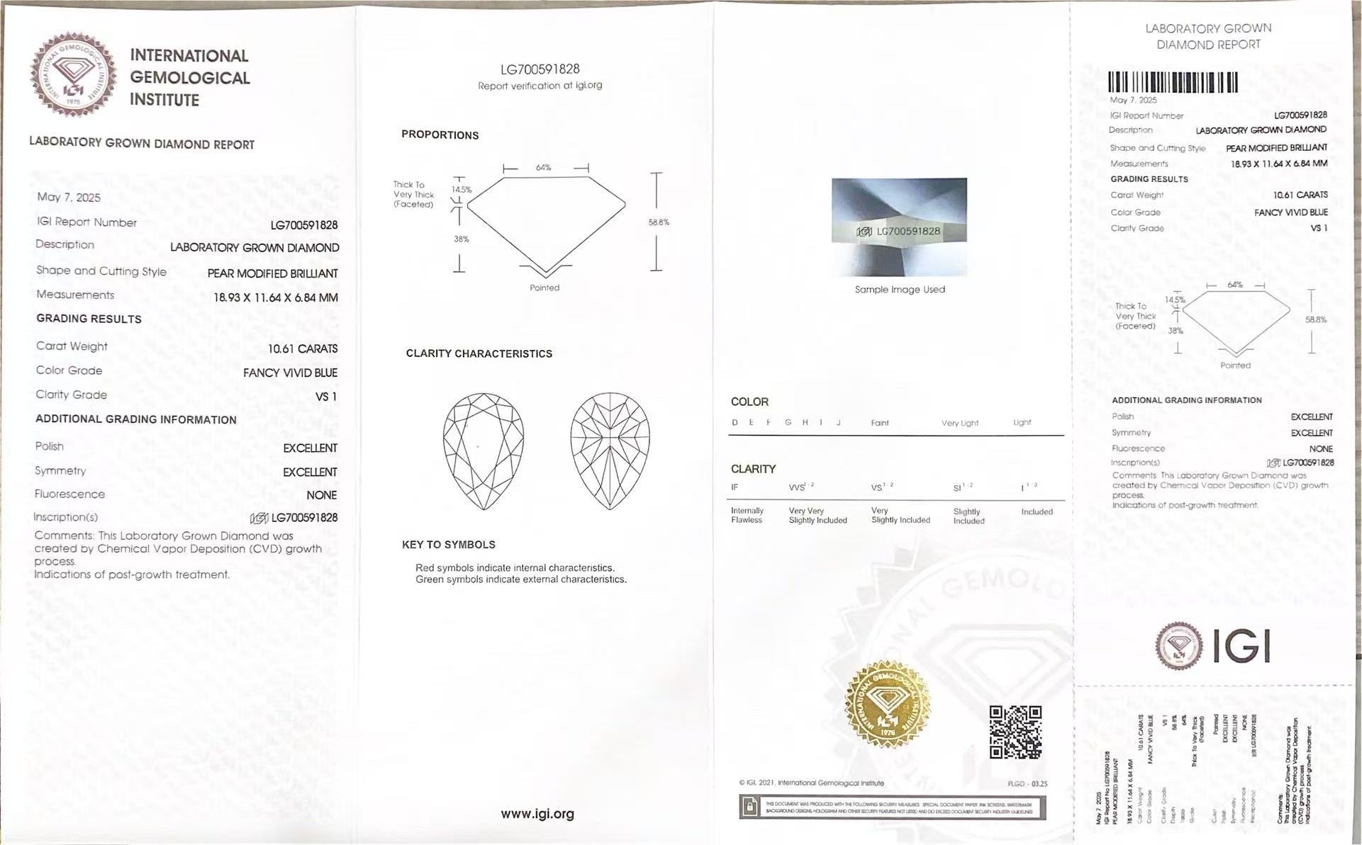 Pear Cut 10.61ct Fancy Vivid Blue VS1 CVD Lab Grown Diamond IGI Certificate LG 700591828