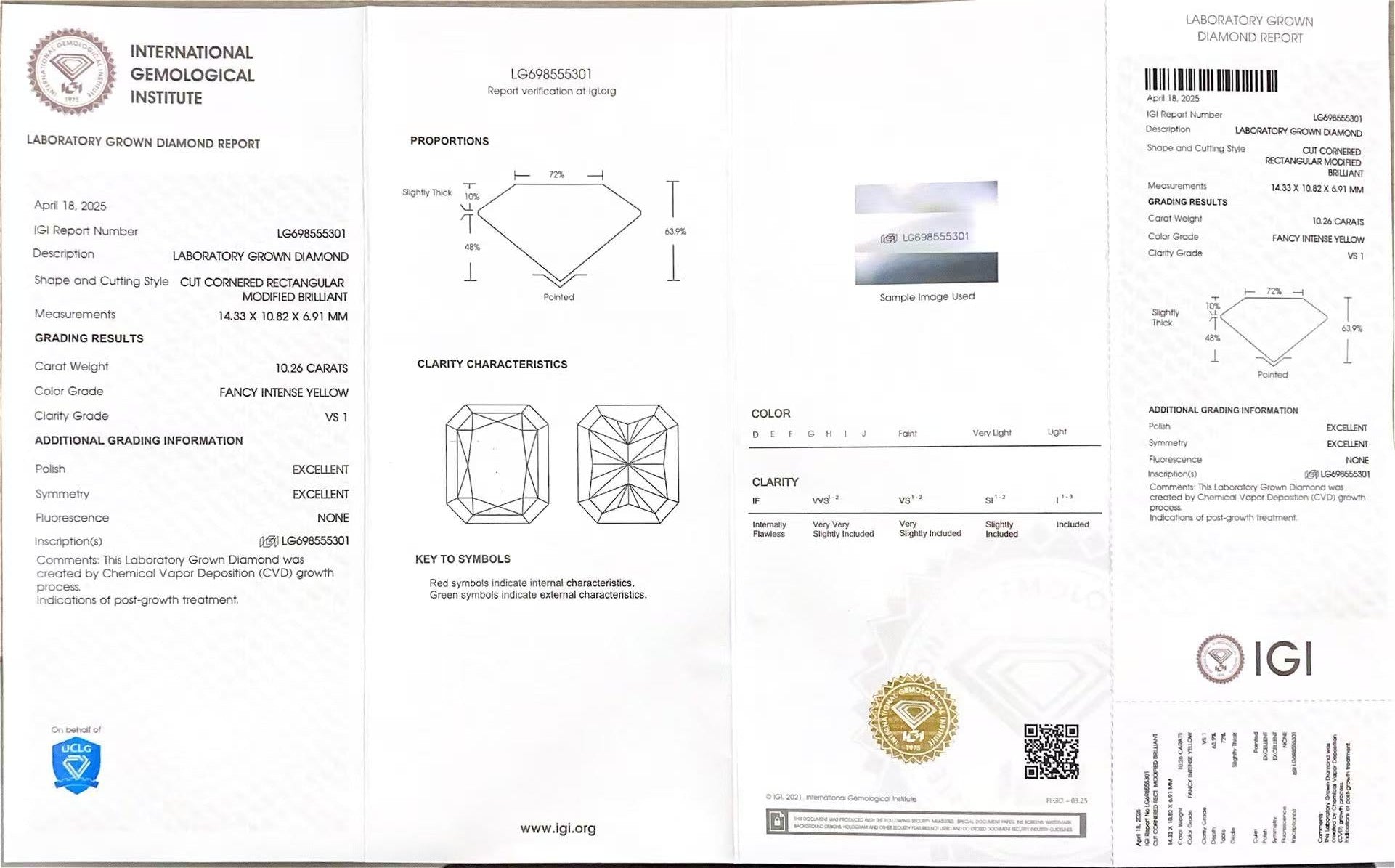 Radiant Cut 10.26ct Fancy Intense Yellow VS1 CVD Lab Grown Diamond IGI Certificate LG 698555301
