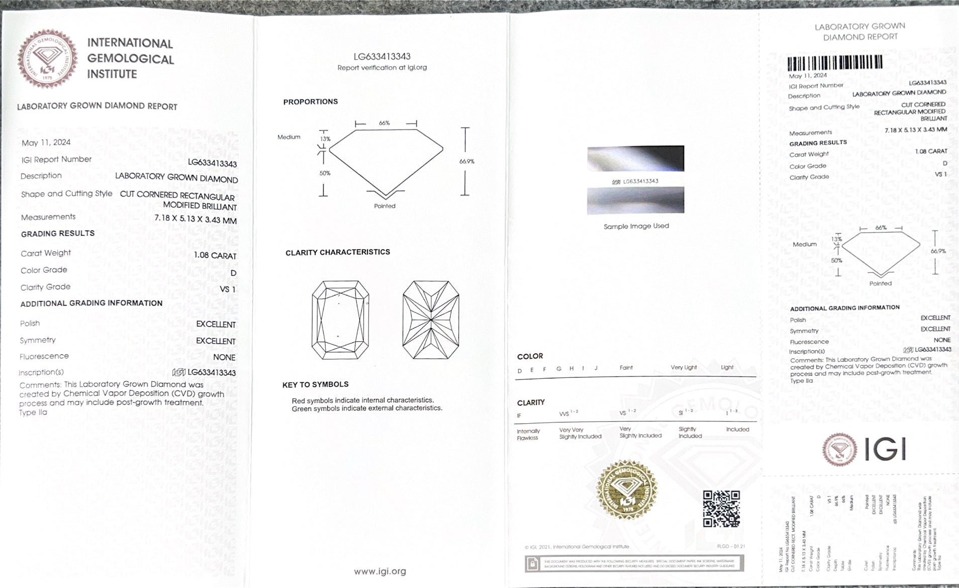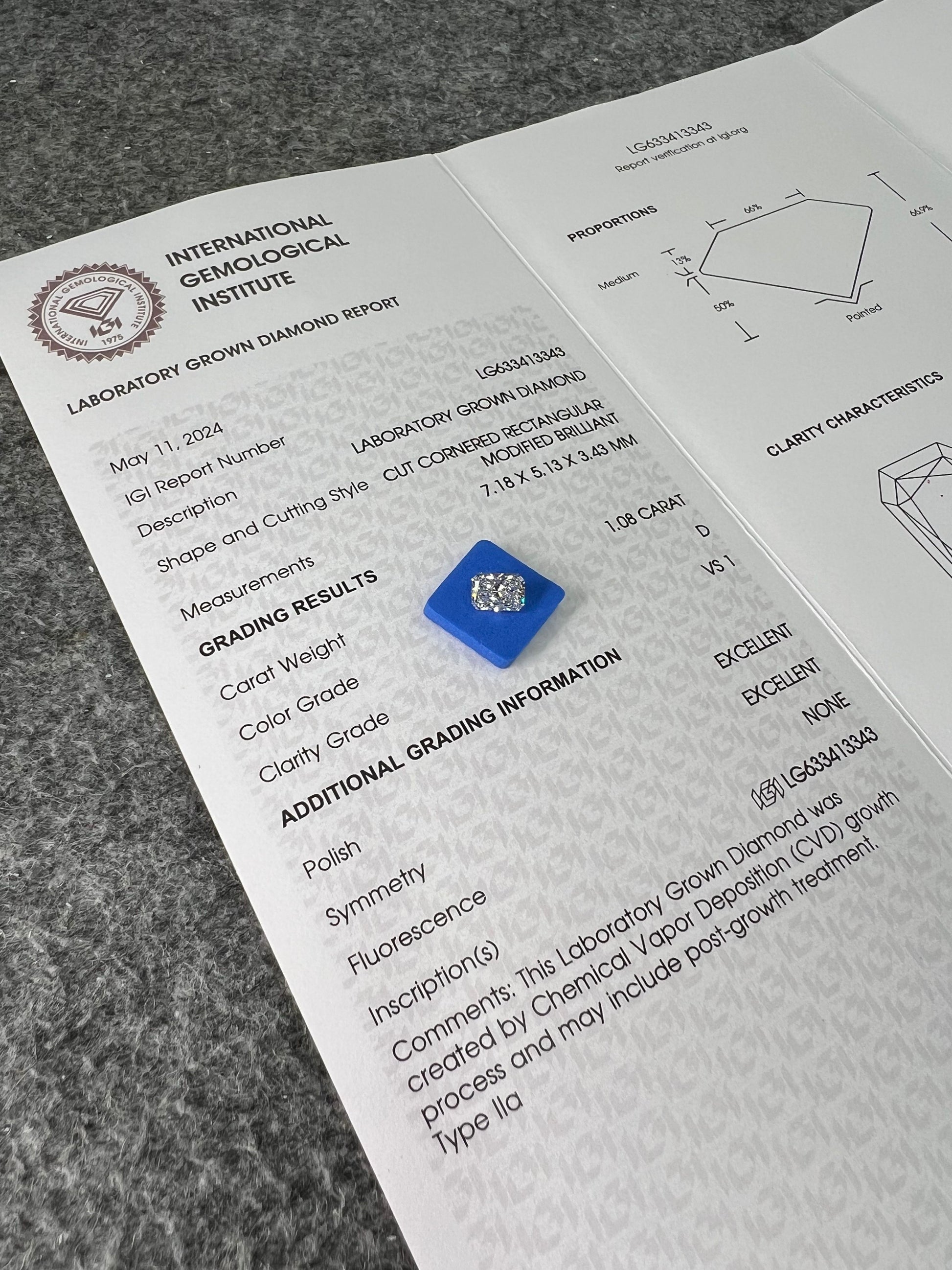 Radiant D VS1 EX EX 1.08ct CVD Lab Grown Diamond with IGI Certificate LG633413343