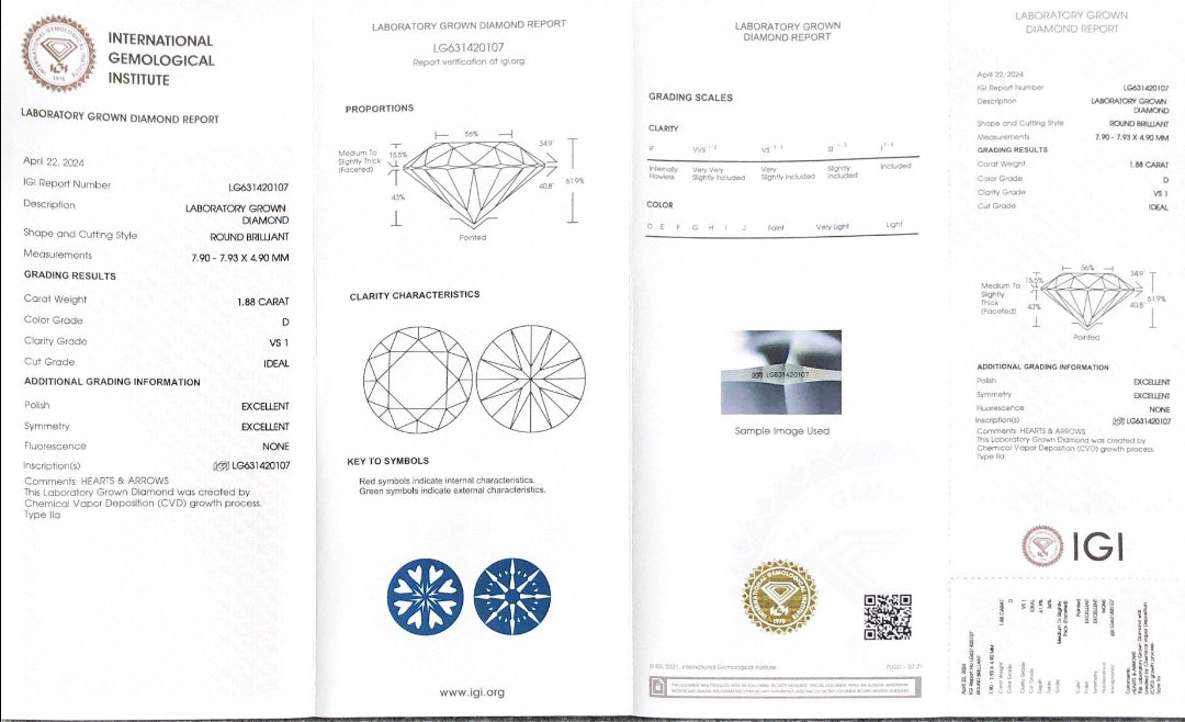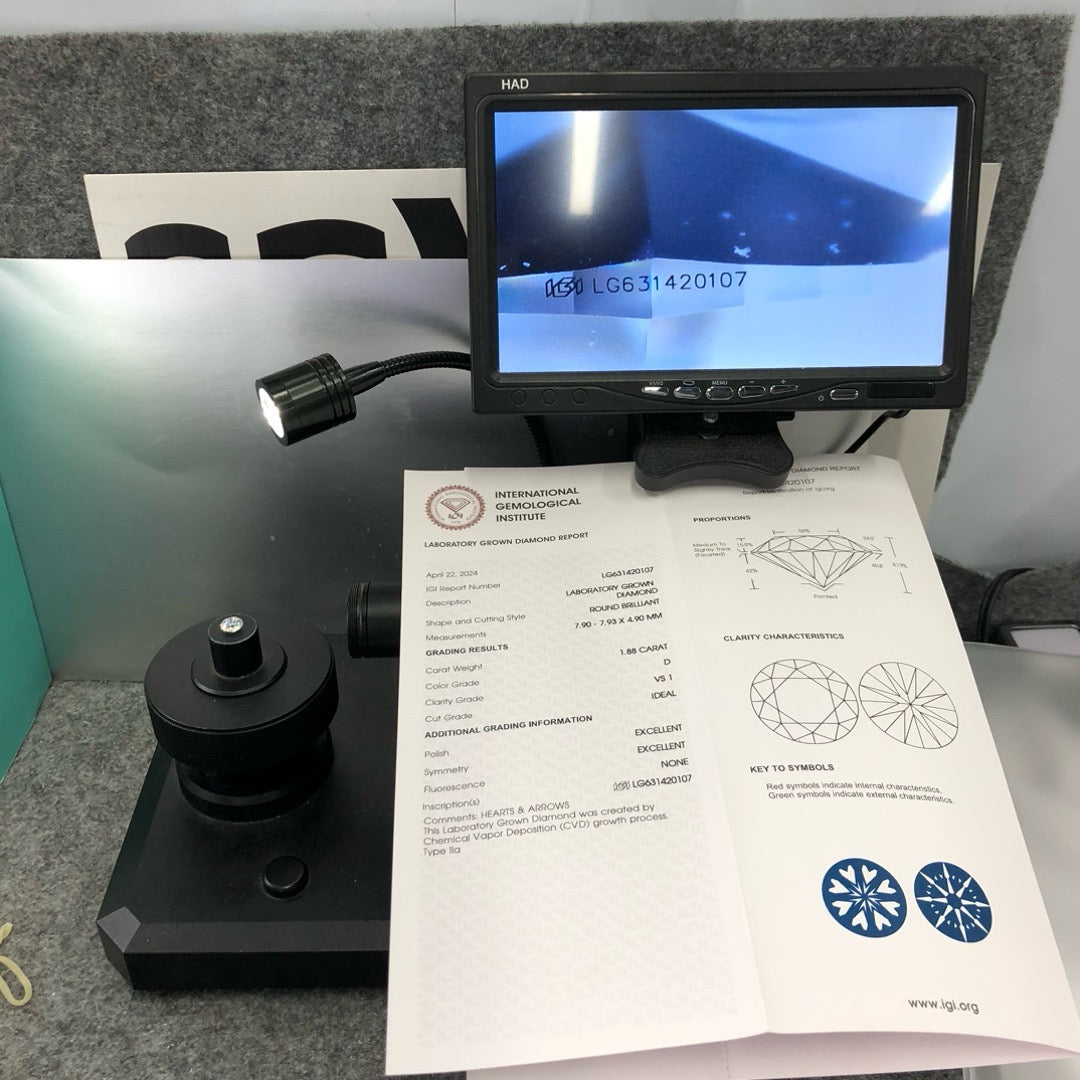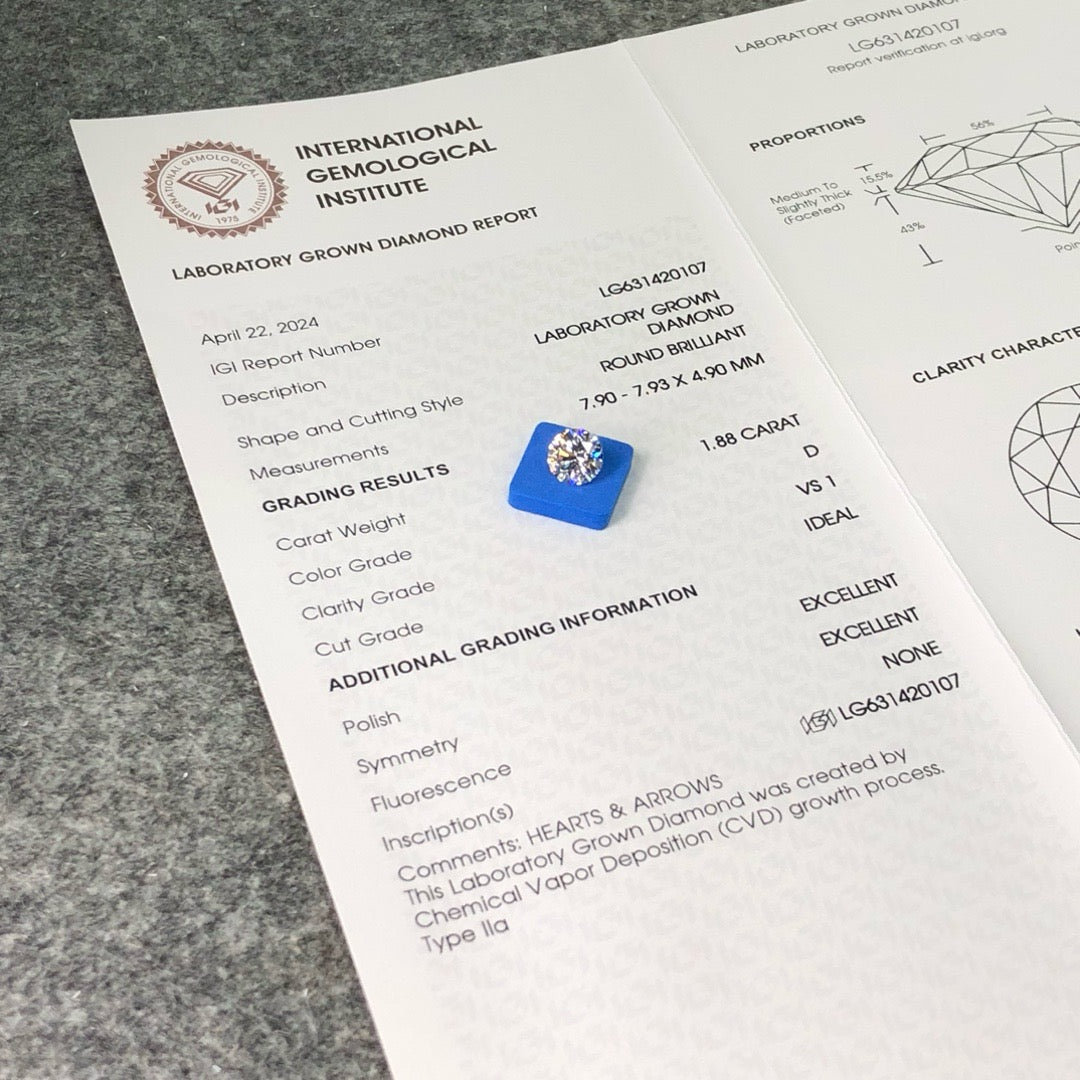 Round Brilliant D VS1 ID EX EX 1.88ct Lab Grown Diamond with IGI Certificate LG631420107 CVD