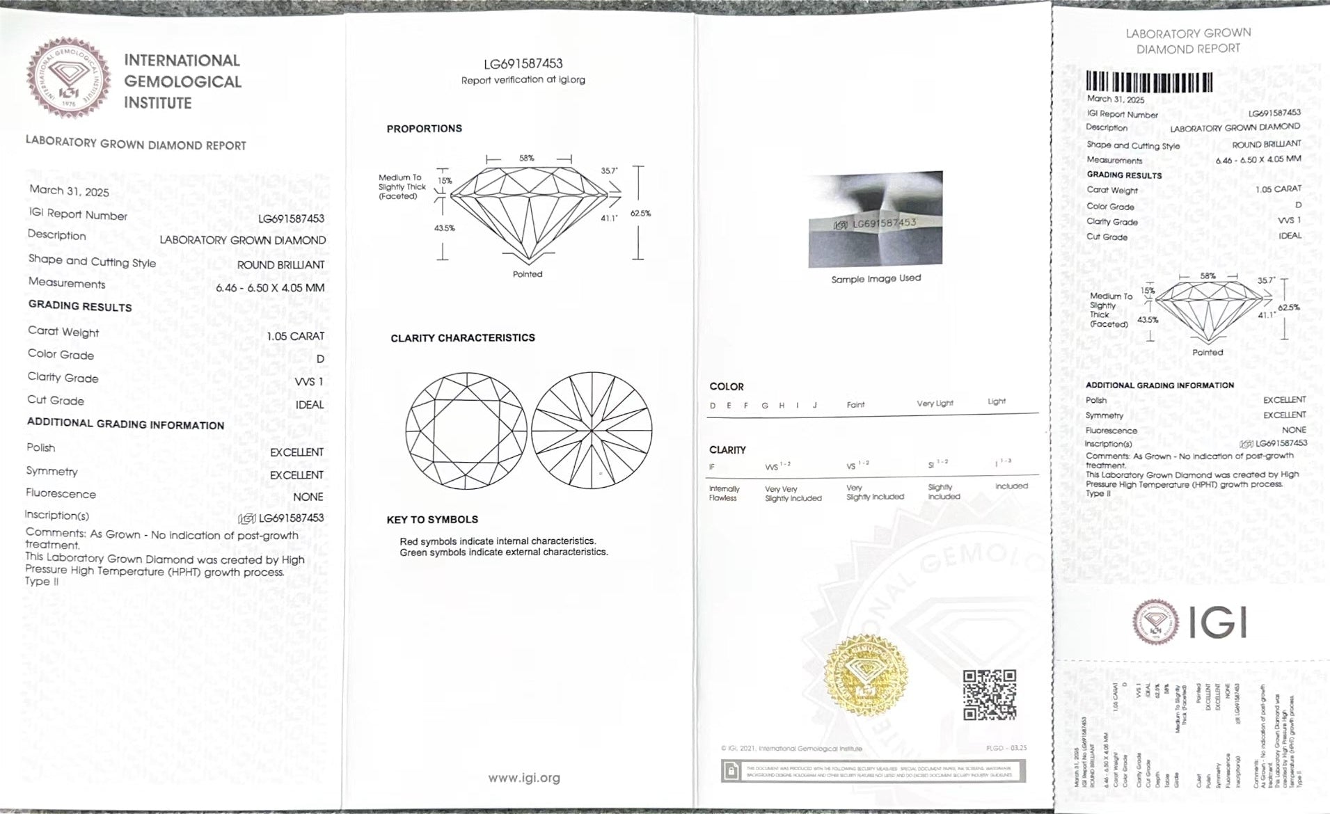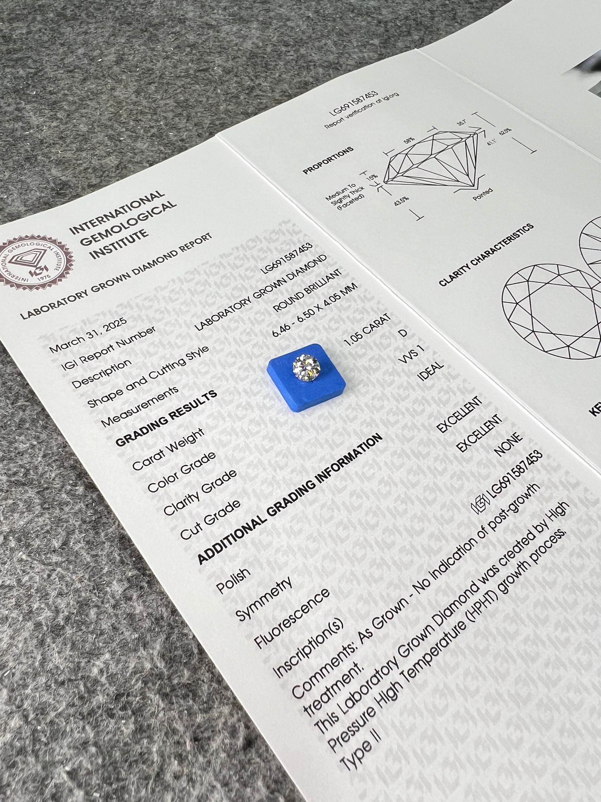 Round Brilliant D VVS1 ID EX EX 1.05ct Lab Grown Diamond with IGI Certificate LG691587453