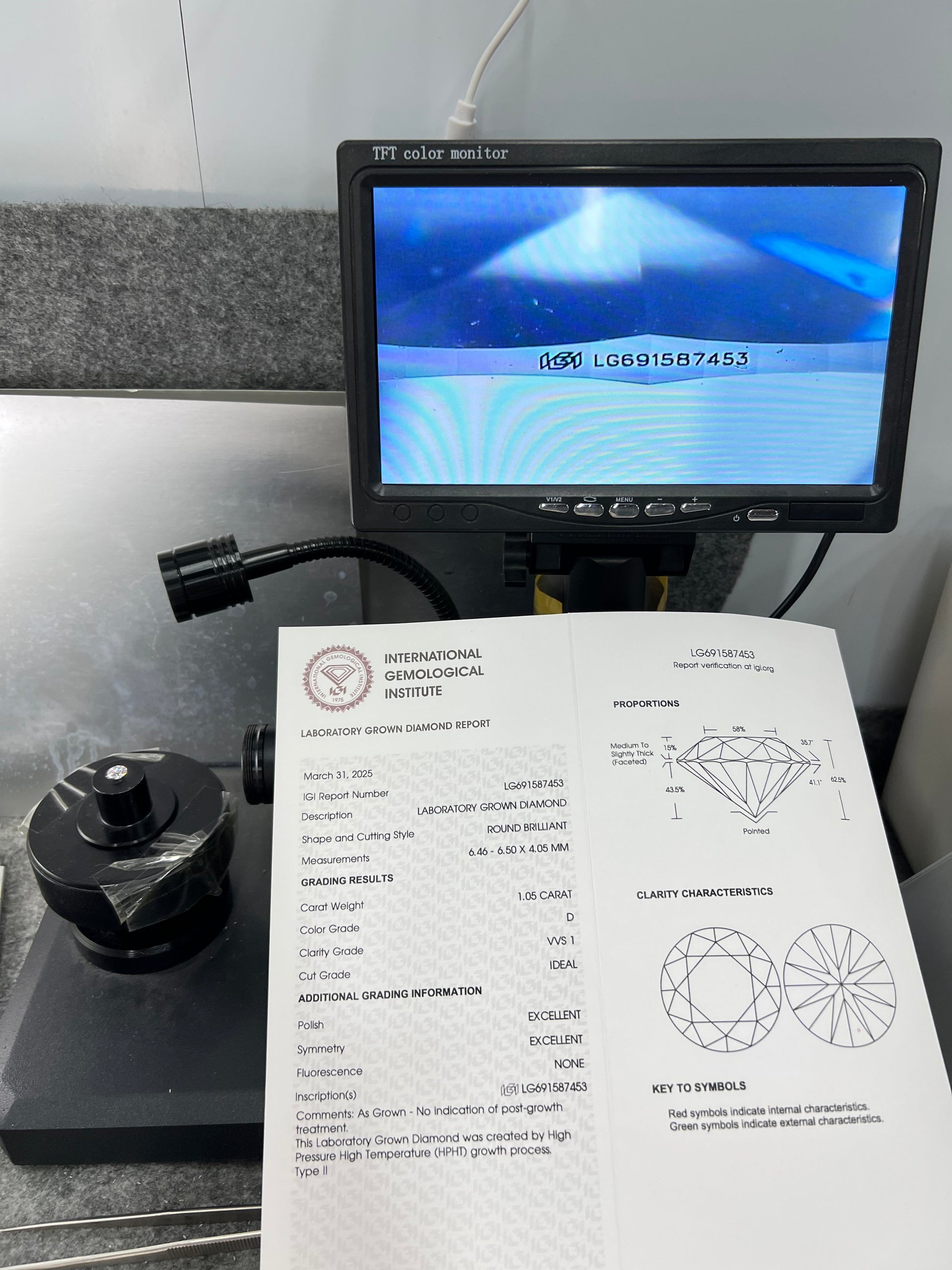 This stunning 1.05-carat round brilliant diamond represents the ideal balance of size and supreme quality. With D color (completely colorless) and VVS1 clarity (virtually flawless), this stone delivers maximum brilliance and exceptional fire. The ideal cut grade ensures perfect light performance, while excellent polish and symmetry create unmatched sparkle. Created using advanced HPHT technology, this diamond surpasses the finest natural stones in both quality and ethical standards.