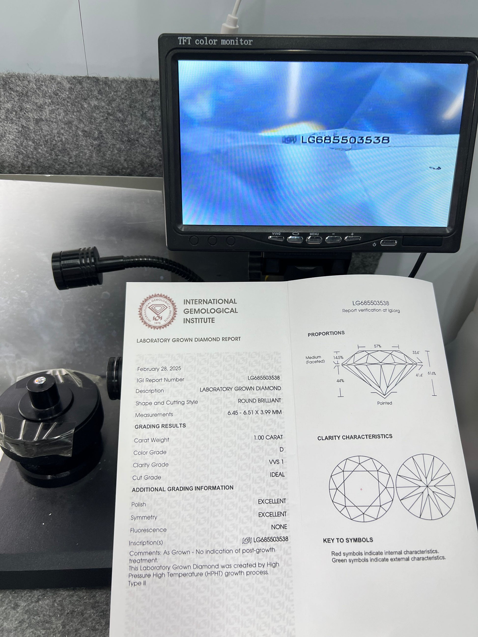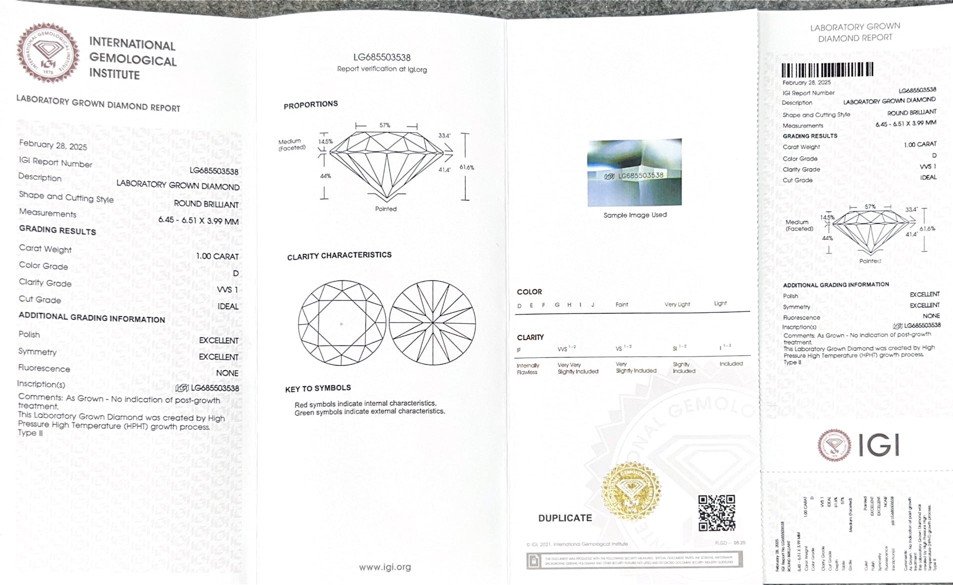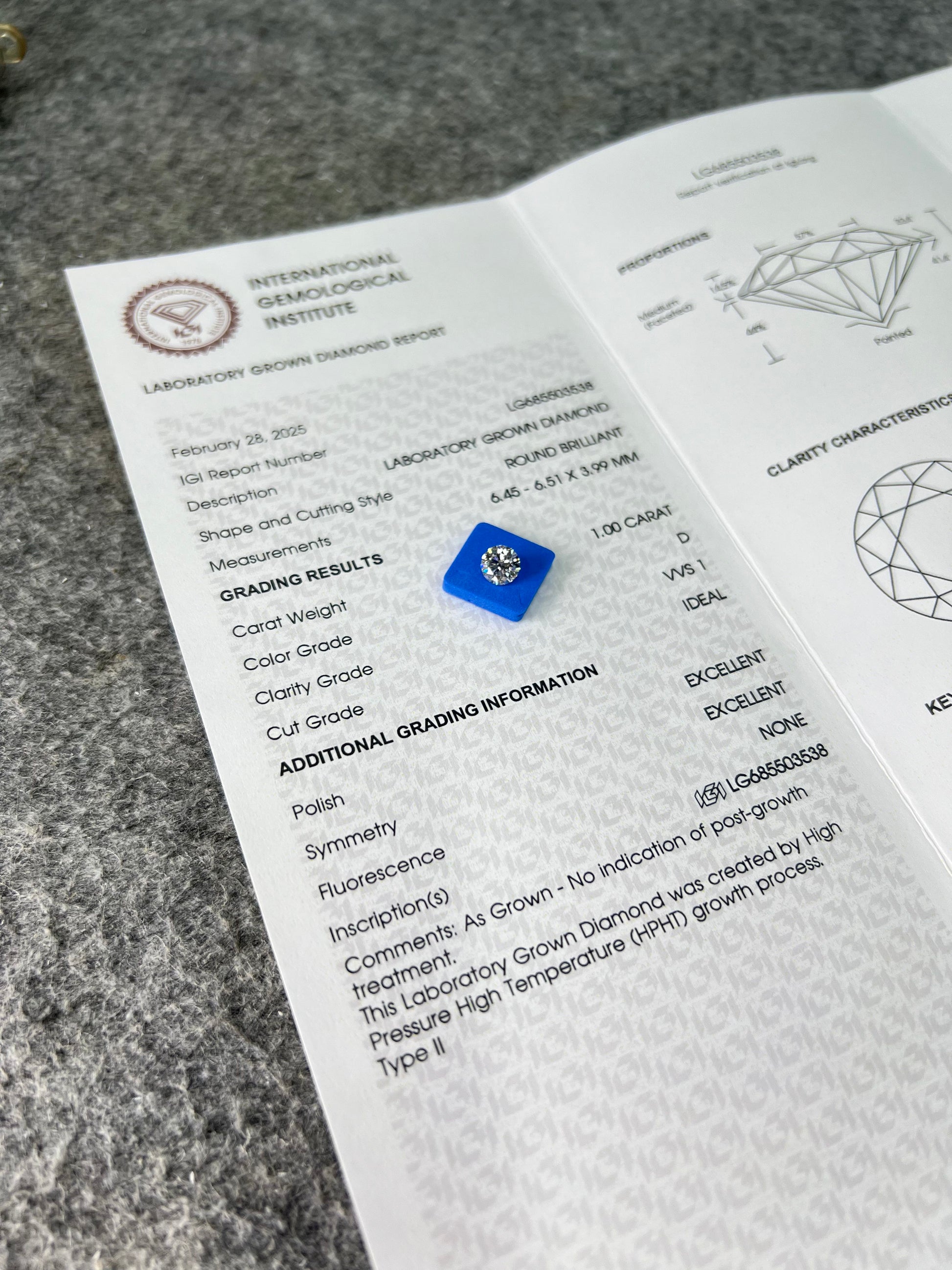 Round Brilliant D VVS1 ID EX EX 1ct Lab Grown Diamond with IGI Certificate LG685503538 HPHT